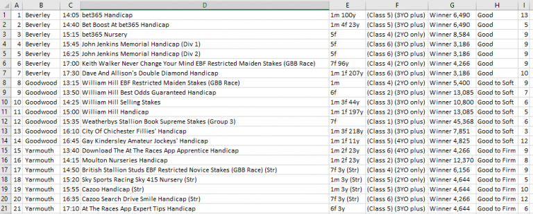 Here are the details contained in the racecard CSV Files. The explanation and screenshots are split into 3 sections and all form the final Racecard.CSV. Firstly the screenshot below is from the races file. It shows columns of data for the race details.