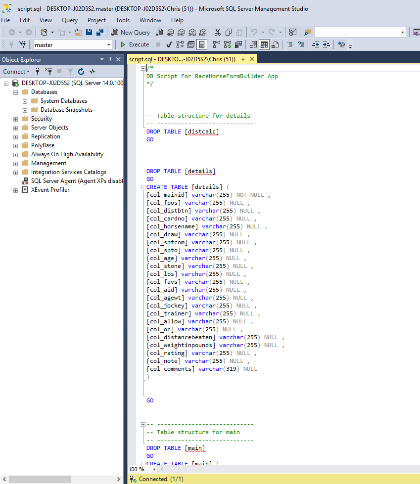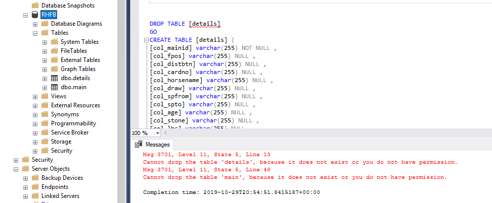 …… Don’t worry about the warnings on not being able to drop tables. This has been left in should you want to rerun the script and the tables are there already. As you can see from the image the Details and Main tables have now been created