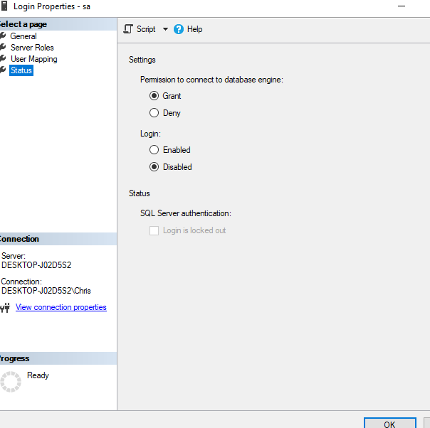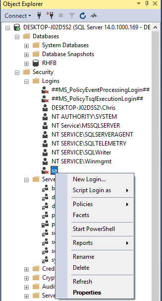 You will see the inbuilt sa account is disabled as denoted by the red cross.