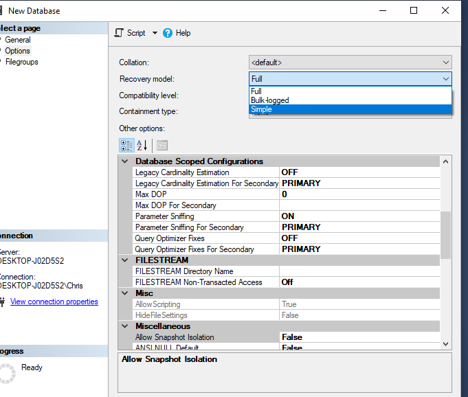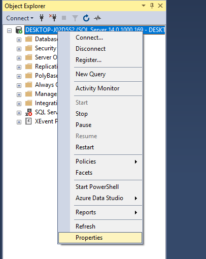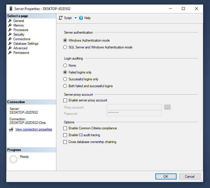 Next go to the Security option. Change the mode to SQL Server and Windows Authentication.