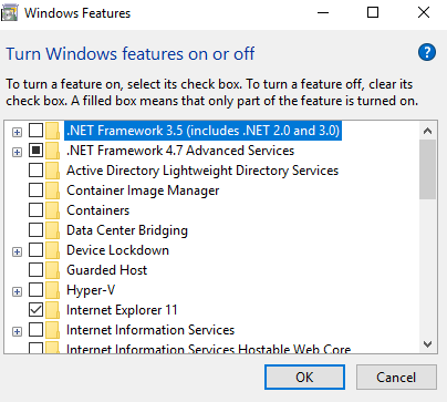 Once the list has been populated click the blank box next to .NET Framework 3.5 (includes .NET 2.0 and 3.0)